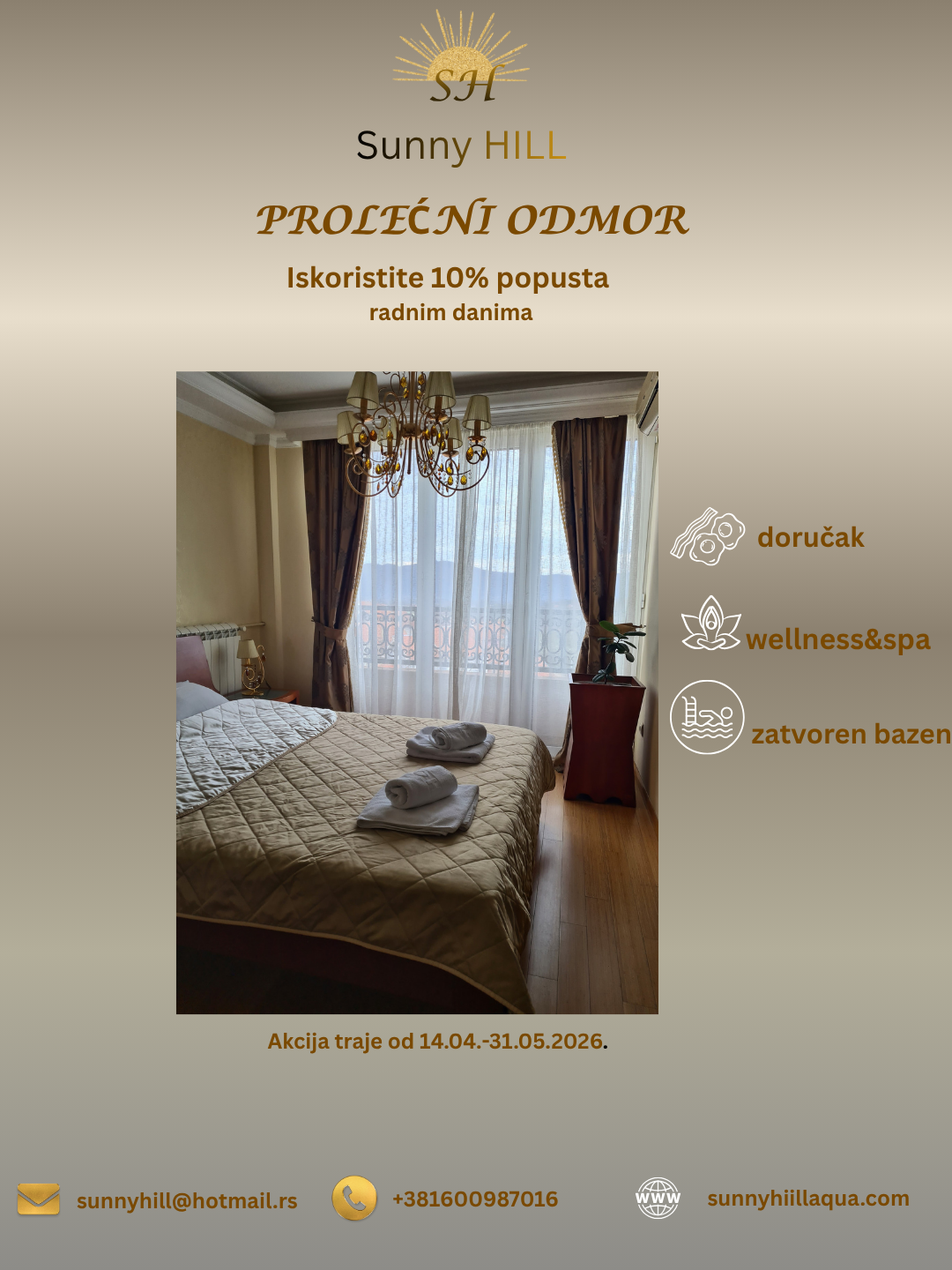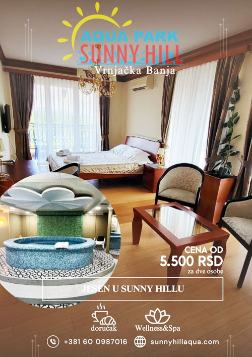 “Sunny Hill” Spa Resort je smešten na svega 600 m od centra Vrnjačke Banje, na mestu zvanom Sunčani breg. Ovaj luksuzni objekat pruža mogućnost savršenog odmora i okupljanja poslovnog i turističkog sveta. Ukoliko poželite za svega desetak minuta lagane šetnje, uz kratak predah i divljenje zamku Belimarković, pored koga obavezno morate proći, stižete do centra zbivanja najvećeg banjskog turističkog centra Srbije. “Sunny Hill” pruža sve ono što je potrebno za savršen odmor. Luksuzno opremljen, ljubazno osoblje, osmišljeni sadržaji i nezaboravan pogled na pitomu dolinu Morave i šumoviti Goč sa terase objekta, zauvek će se urezati u Vaše sećanje. “Sunny Hill” Vas očekuje.
